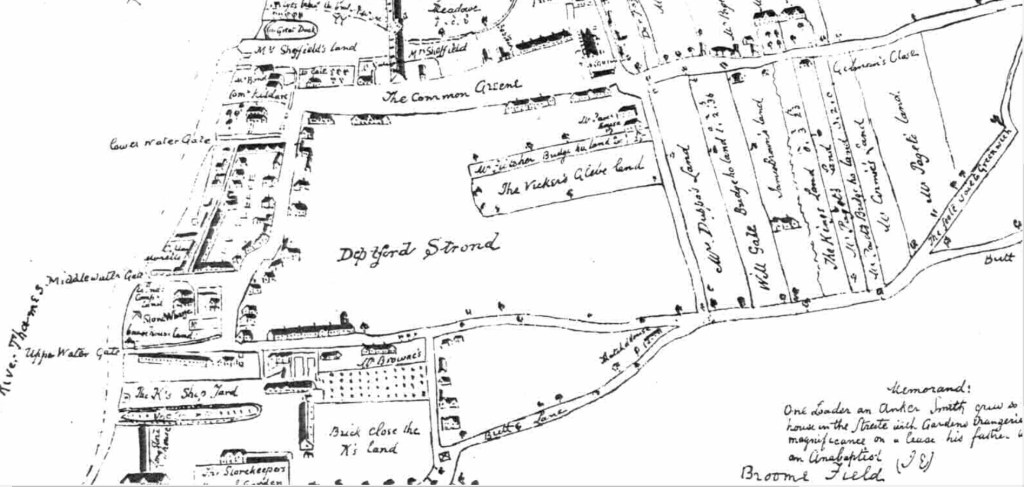 And a small diversion to John Evelyn, [13] whose drawing of Deptford in 1623 I have posted above. I have long known of Evelyn as a very important 17thC horticulturalist and of his seminal Sylva, or A Discourse of Forest-Trees and the Propagation of Timber of 1662, [14] [15] [16] but didn’t know of his Deptford connection. In fact he lived, wrote and experimented with growing plants, in Deptford for many years, in Sayes Court, just to the west of King Street and which was many years later, in the 19thC, incorporated into the expanded Royal Dockyard and later Convoys Wharf. Fascinatingly in the early 21stC excavations at Convoys Wharf show that the foundations of Sayes Court are still entirely in place!