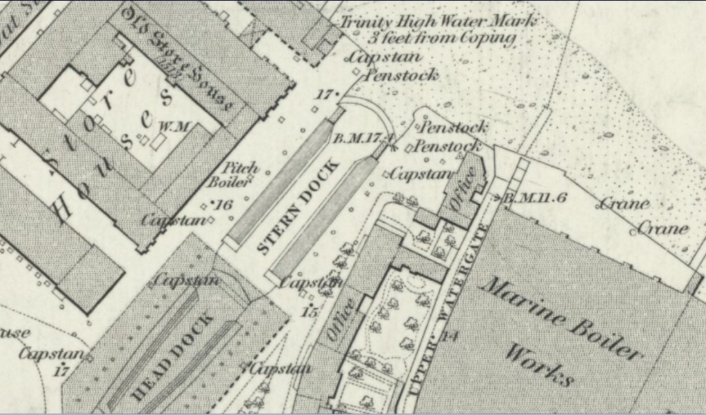 We know the Eastern Boundary Wall was built in the late 18thC .. the dockyard had expanded east at that point to Watergate Street. “By 1774, historic mapping shows a new boundary wall in two sections” [8]