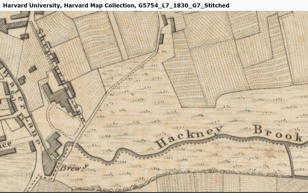 Site of Anderson Road in 1830. Compare to 1863 map and note bends on the Brook.