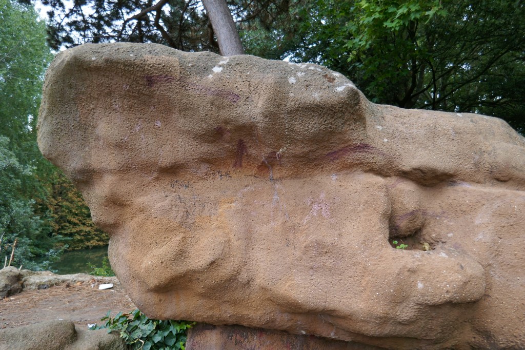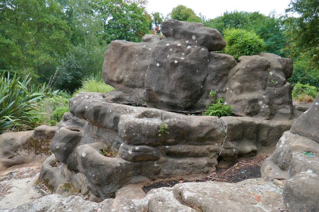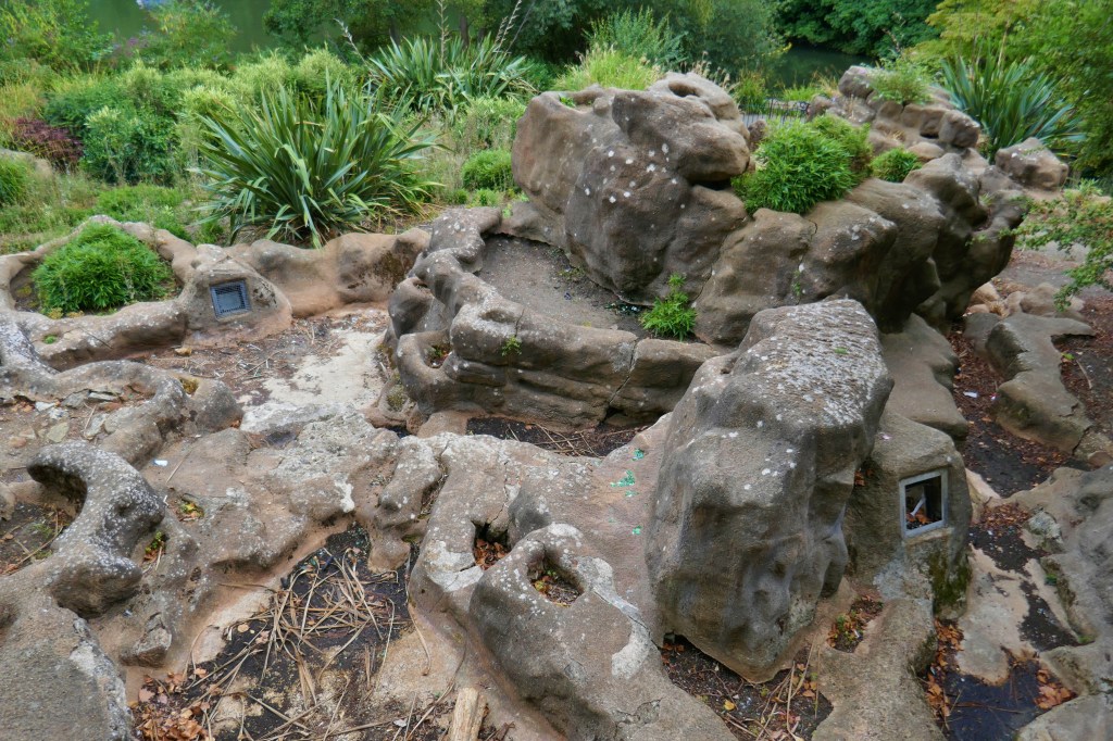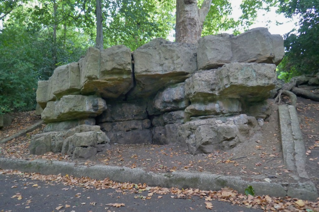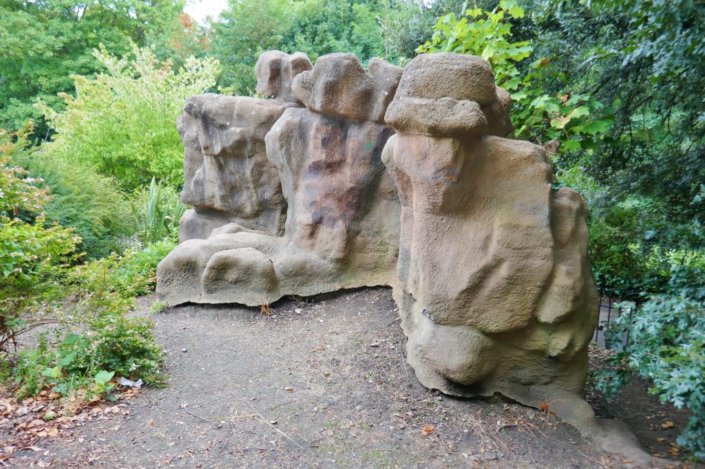 Following on from the Building London introduction to Pulhamite, https://buildinglondon.blog/2022/09/01/49pulhamite-pt1-an-introduction/ the best place to go and see Pulhamite artificial rock in London is in Battersea Park. [1] There is an amazing area of ‘rock’ faces and a waterfall called The Cascades though currently, sadly, dry, and a smaller ‘rock face’ nearby called The Owlery!