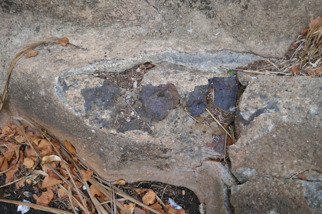 As noted above, that the restoration was badly done, it’s possible that some of the surfaces now visible are not Pulhamite but spray-on concrete from the 1980s restoration. There are places though where the ‘concrete’ is clearly Pulhamite and the base of burnt bricks is visible.