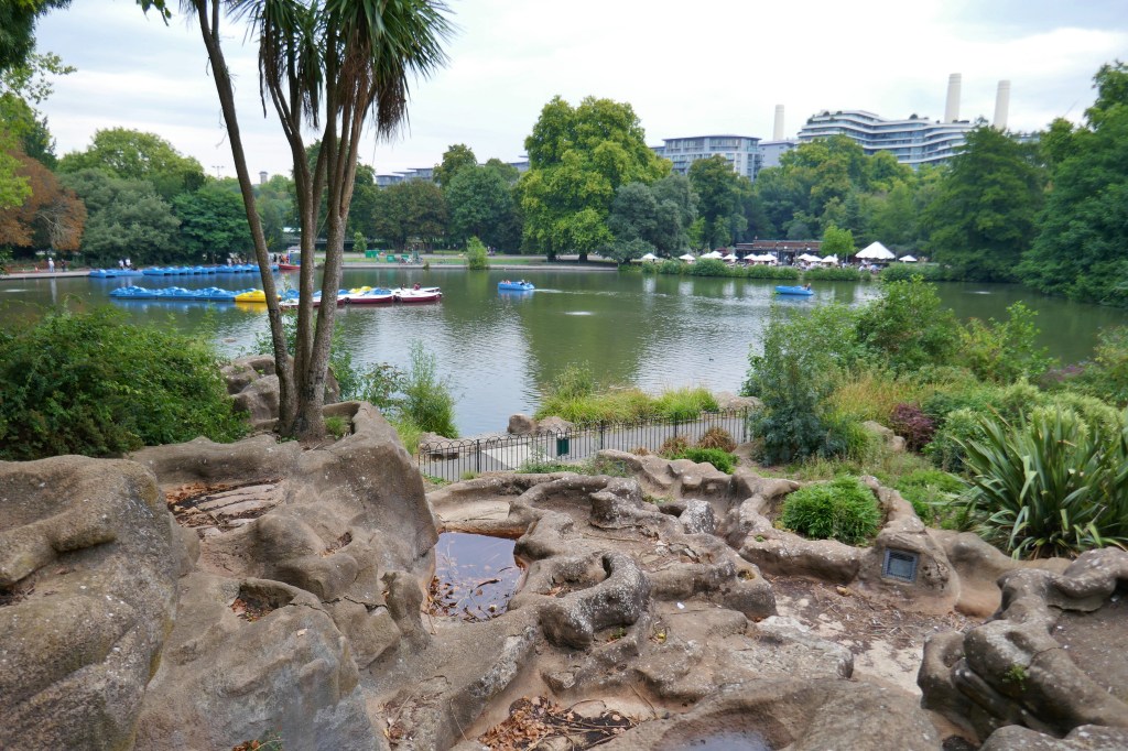 For now though they are a fine set of, albeit artificial, rocks, very unusual to see in London, and on the visit of Building London were being well used by visitors, young kids with their parents practising rock scrambling, older kids chilling and tourists, and bloggers, sitting and having a quiet beer overlooking the boating lake! ( and thank you Sophie from Sydney for the beer! 😀 )