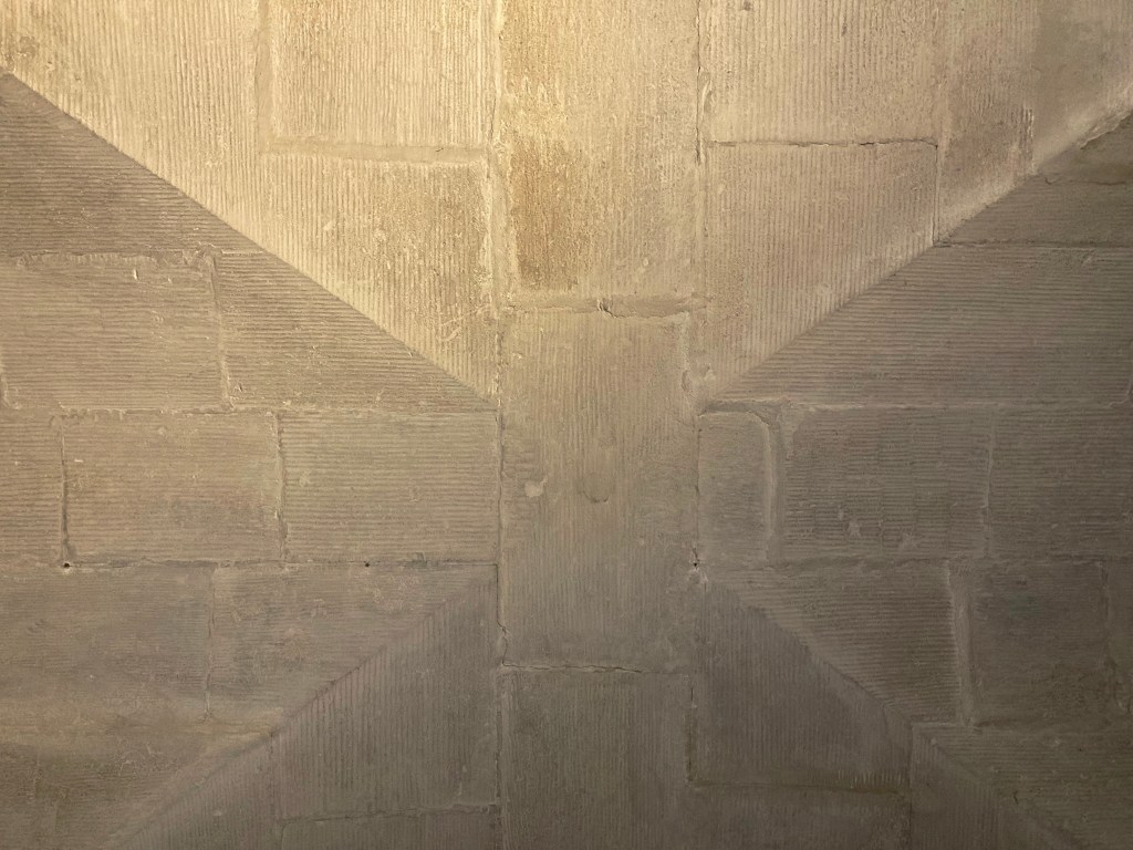 Tim Tatton-Brown notes The Jewel Tower is not just built from rubble Kentish ragstone but dressed stone, but only on the outward facing walls. “… the finest visible example is the Jewel Tower, where the beautiful ashlar masonry plinth of the tower, and the masonry walls of the moat, show the quality of masonry that Thomas Hardegrey could produce in the mid-1360s. One can also see very good external masonry on the tower itself, while on the ‘inside’ faces behind (and only facing the King’s garden), rough-coursed rubble is used.”