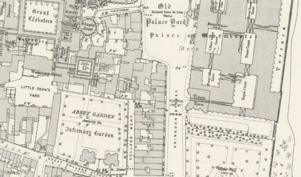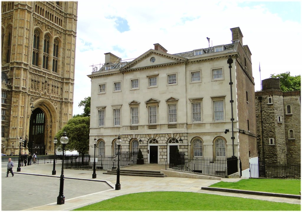 Luckily it wasn’t demolished and Hare got his way 50 or so years later when following war time bomb damage Abingdon Street, a row of Georgian houses that stood between the tower and Parliament, was demolished. Only 1 of the buildings that surrounded, 6-7 Old Palace Yard, a fine Georgian house, now remains, [7] while Abingdon Street is now a public park with views of the Houses of Parliament, the medieval College Green walls and the Jewel Tower