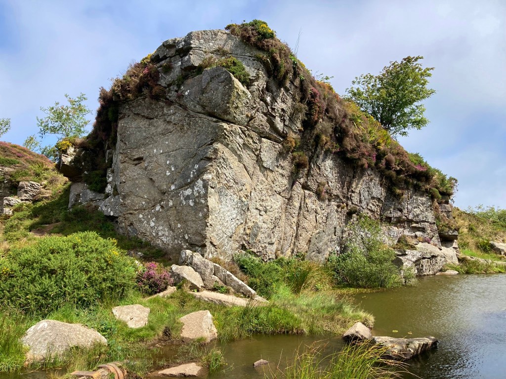 “A granite quarry northeast from the Hay Tor Rocks. Worked for the ‘blue’ granite between 1820 and 1918 as building material. The quarry contains three types of granite. A ‘blue’ granite which was mined and used for buildings such as the (reconstruction of) London Bridge found in the middle of the quarry, an ‘orange’ granite which had been heavily weathered and crumbled very easily (making it useless as a building material) found at the top of the quarry and the giant, ‘megacrystic’ granite that is typical of the Hay Tor region found on the quarry floor. The blue granite and orange granite are intrusions into the megacrystic granite, with the orange granite overlying the blue granite.” [4]