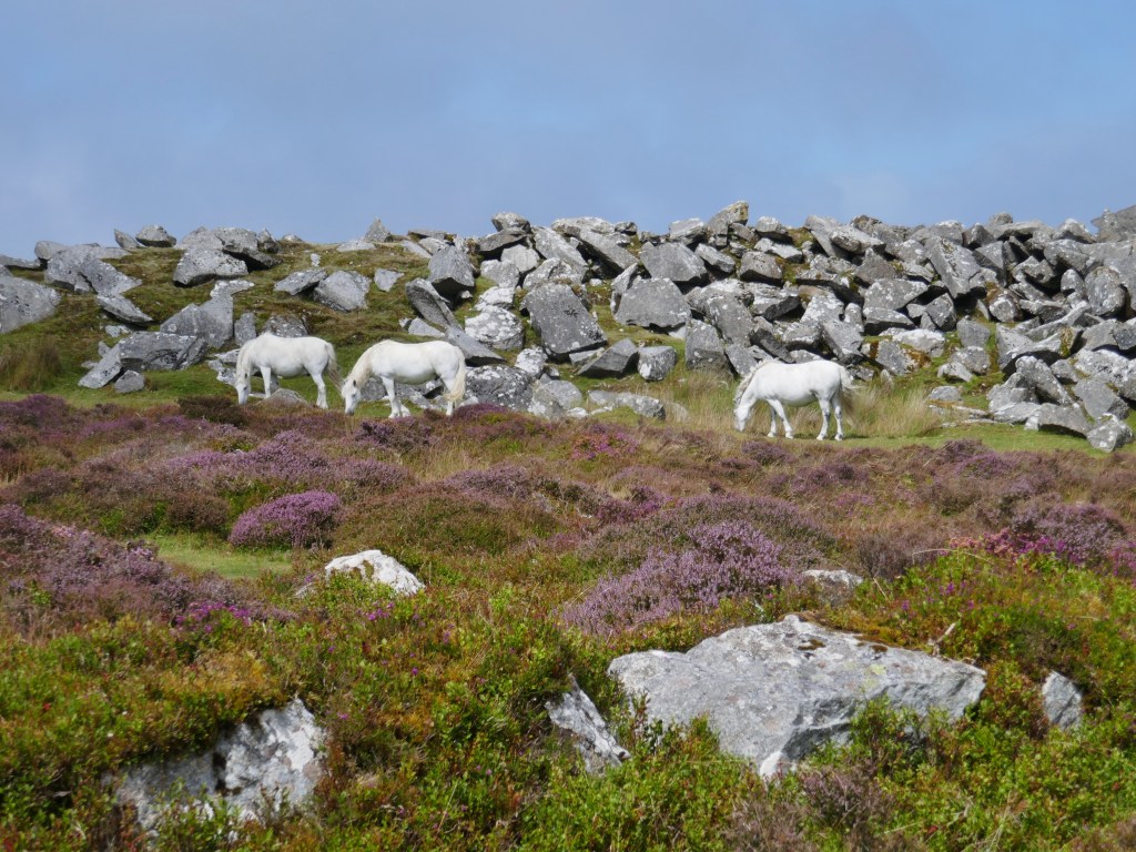 Dartmoor ponies grazing in front of a Haytor quarry spoil heap
