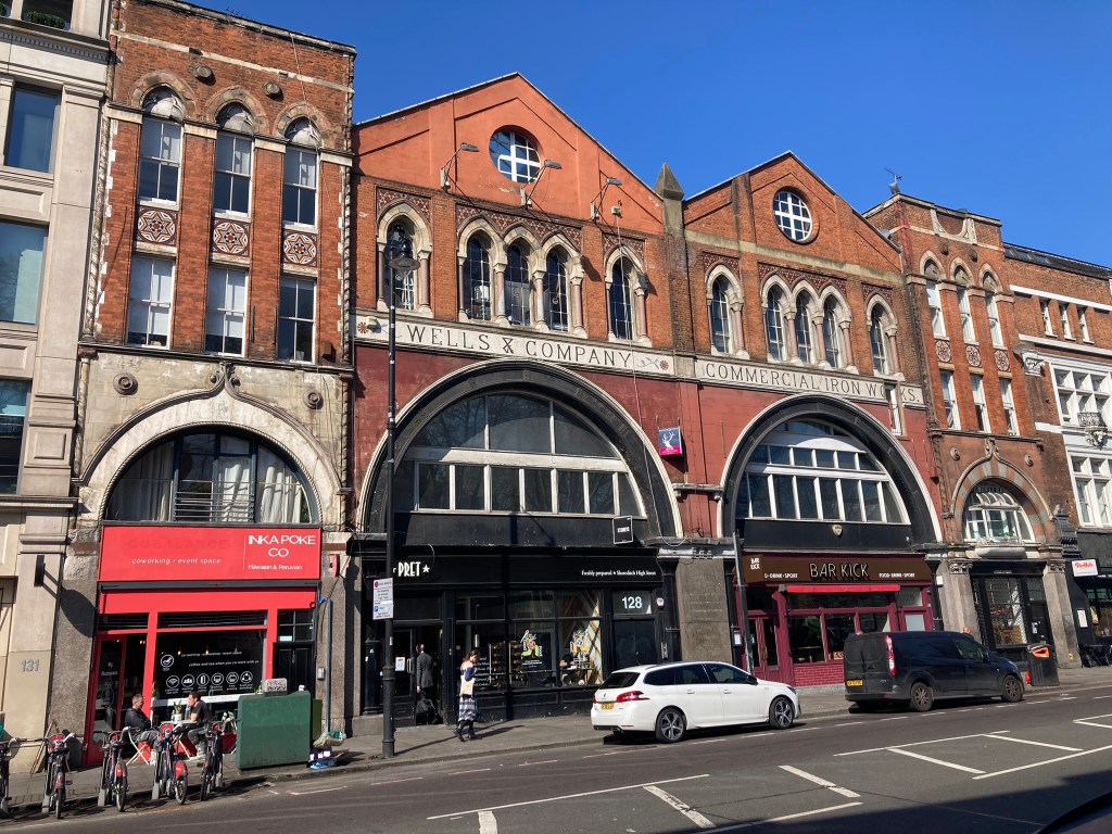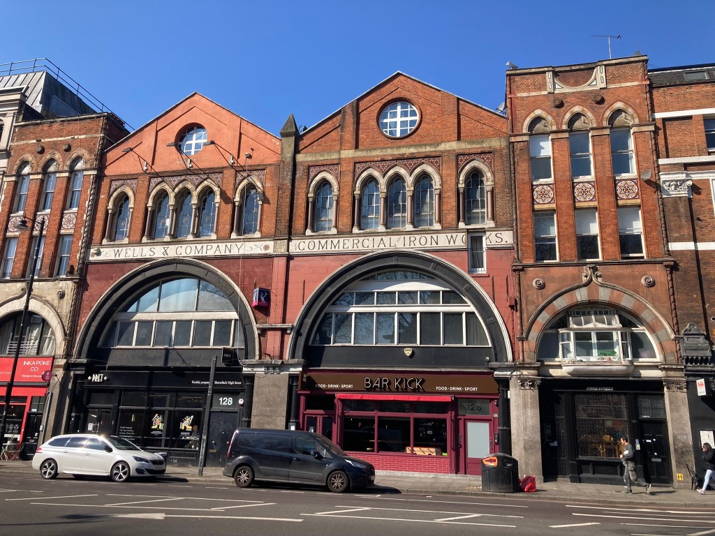 The title across the 4 linked buildings states “WELLS & COMPANY COMMERCIAL IRONWORKS”. Victorianweb states “Wells & Co. were cabinet ironmongers and this was their purpose-built foundry and showroom” [1] though it is not clear where the foundary or ironworks itself was. Wells also had the railway arches behind so maybe here. [3]