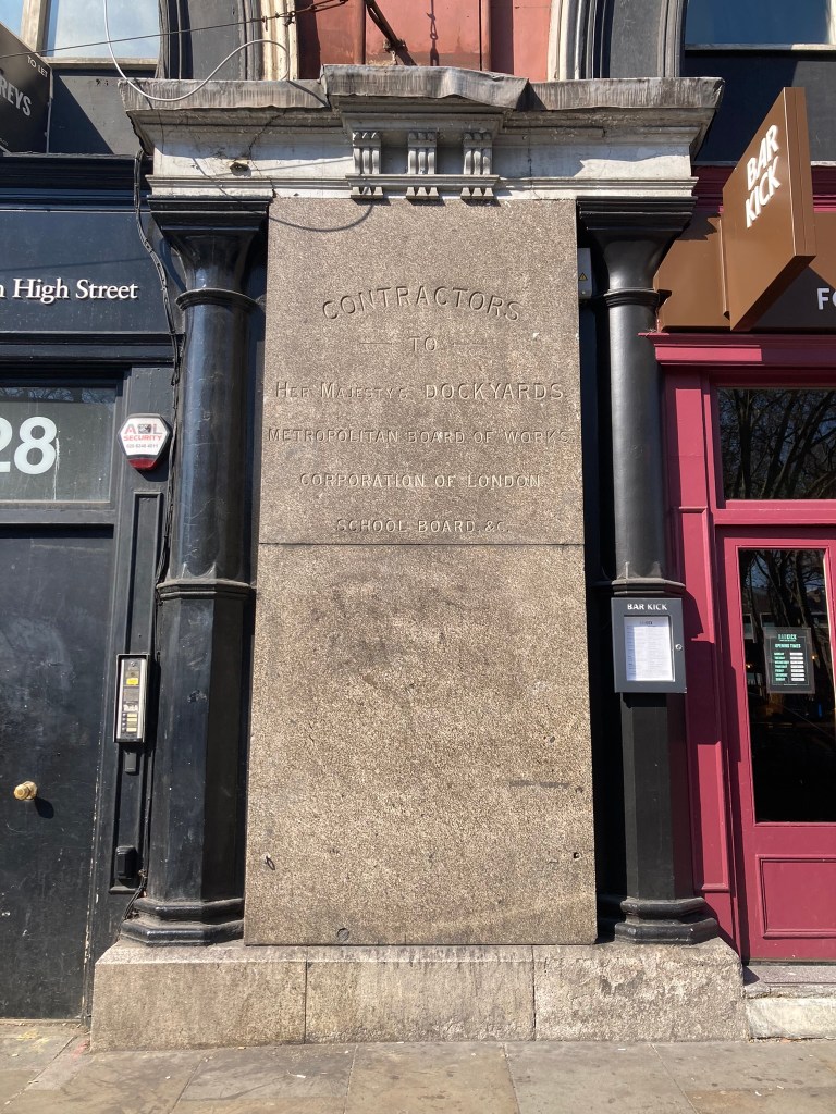 There is an inscription on a large granite upright stating “Contractors to HM Dockyards, Metropolitan Board of Works, Corporation of London School Board.” It feels the lower one should have something too but there is nothing. [4]